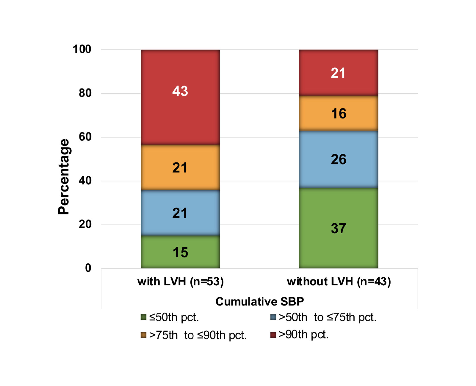 Dargestellt sind die Anteil der Patienten, die den vier verschiedenen kumulativen SBP-Kategorien ausgesetzt sind, differenziert nach Vorliegen oder Nichtvorliegen einer LVH. Die dargestellten Daten basieren auf einer Kohorte von Kindern und Jugendlichen nach Nierentransplantation (n = 96; 1,1 ± 0,4 Jahre nach Studienbeginn). Pct. bezeichnet den Perzentilwert.