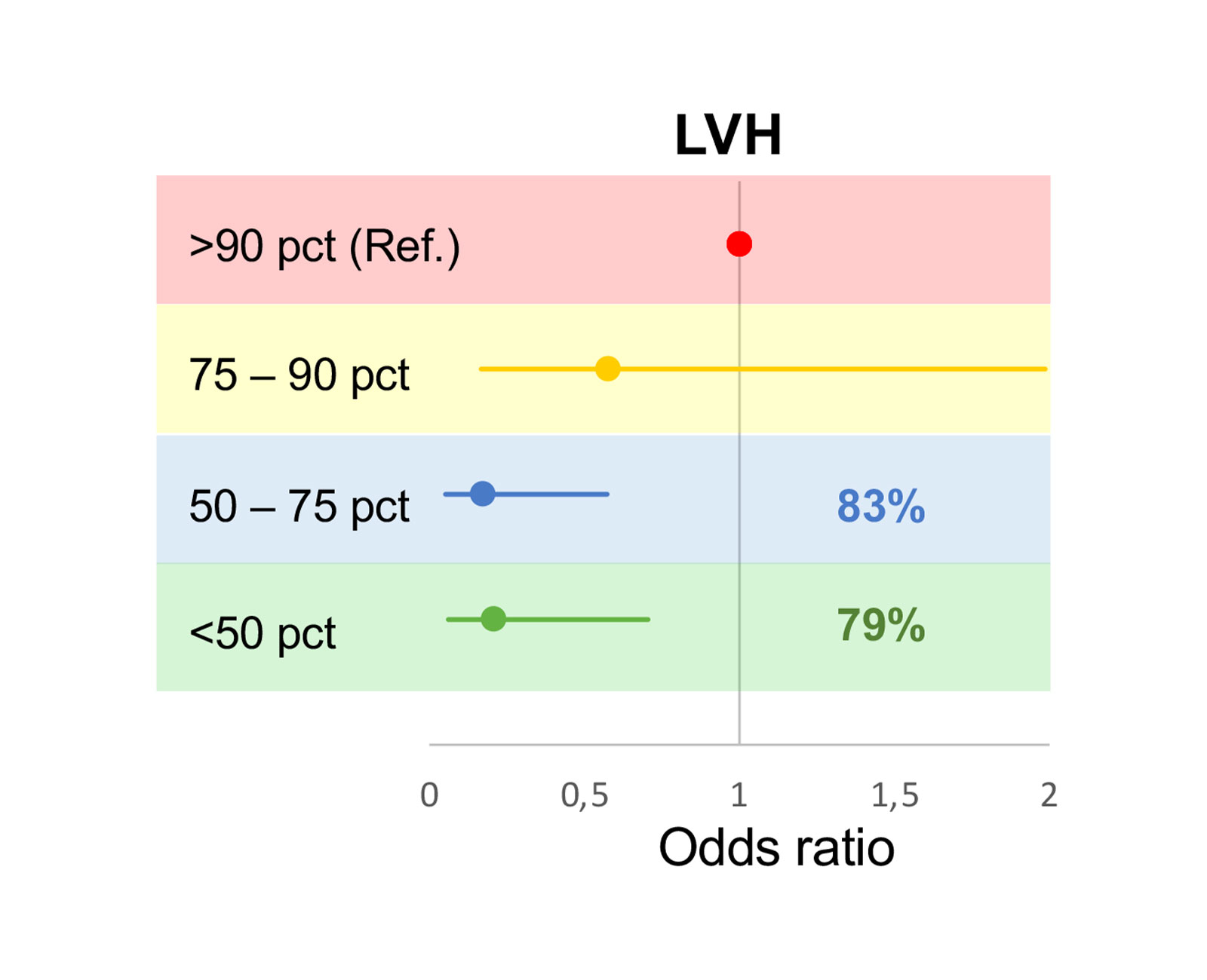 Eine Blutdruckexposition unterhalb der 75. Perzentile (pct) senkt das Risiko einer linksventrikulären Hypertrophie (LVH) um etwa 80%.